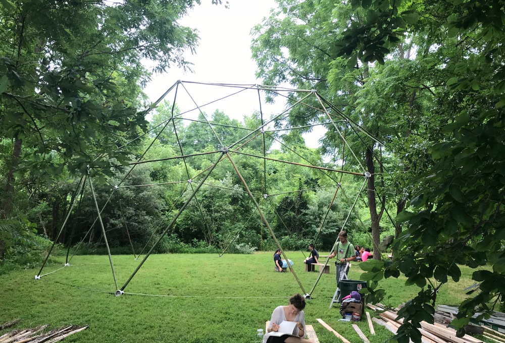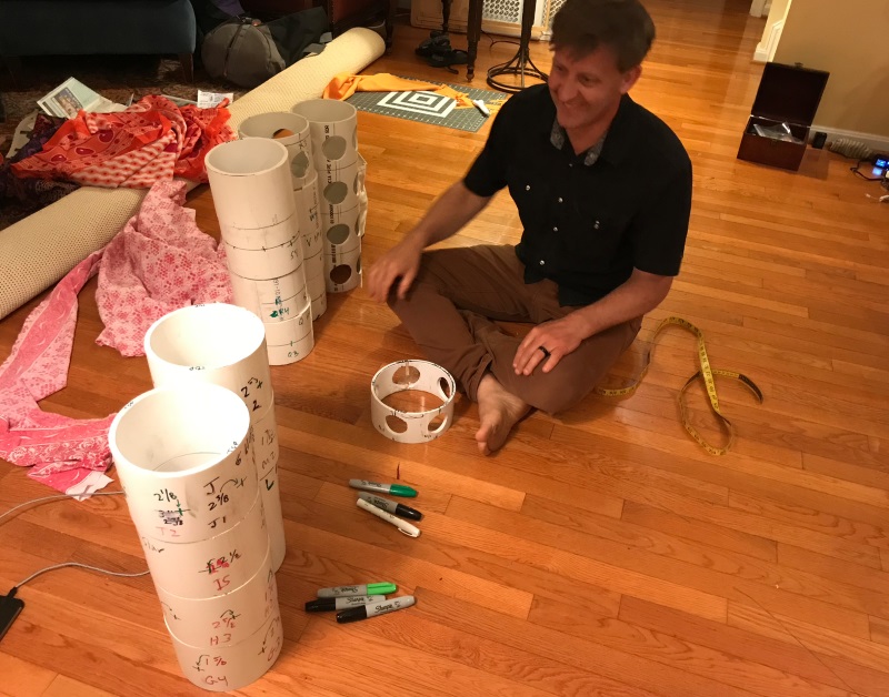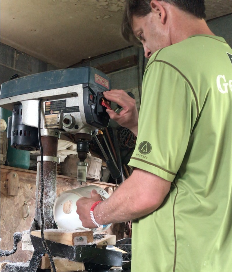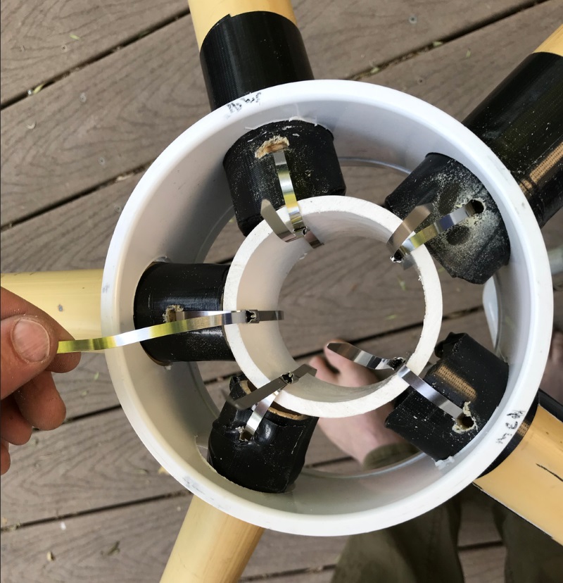 Ken is using various size hole saws to drill the appropriate hole size in the outer collar to match the bamboo strut diameter.